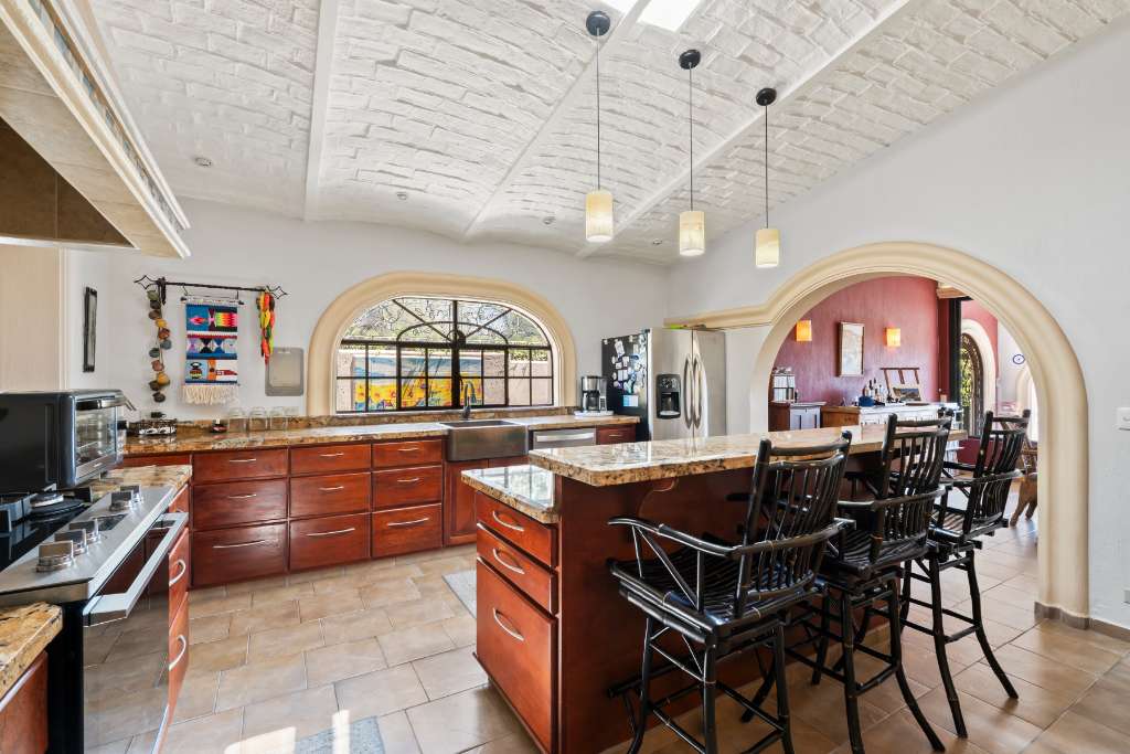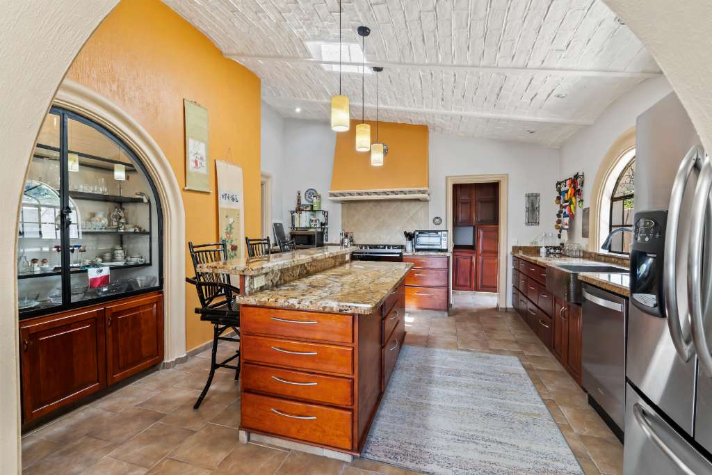 Otro arco conduce a la luminosa cocina, que cuenta con una barra de desayuno, abundante espacio de almacenamiento, una generosa encimera y una vitrina empotrada. Junto a la cocina se encuentra una despensa con lavadoras y secadoras apiladas, ordenadas en su propio armario, y con acceso directo al patio trasero, ideal para el entretenimiento y el comedor.