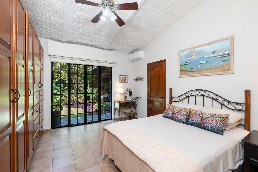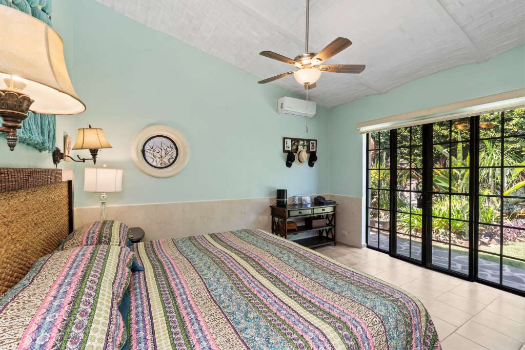 La suite principal ofrece un amplio vestidor y vistas tranquilas a los exuberantes jardines traseros. La ventana del dormitorio de invitados también da al jardín y ofrece un cómodo acceso a la terraza cubierta. El patio trasero es maravillosamente privado, con una fuente serena y vibrantes plantas de aves del paraíso, creando un entorno apacible para relajarse o recibir invitados.
