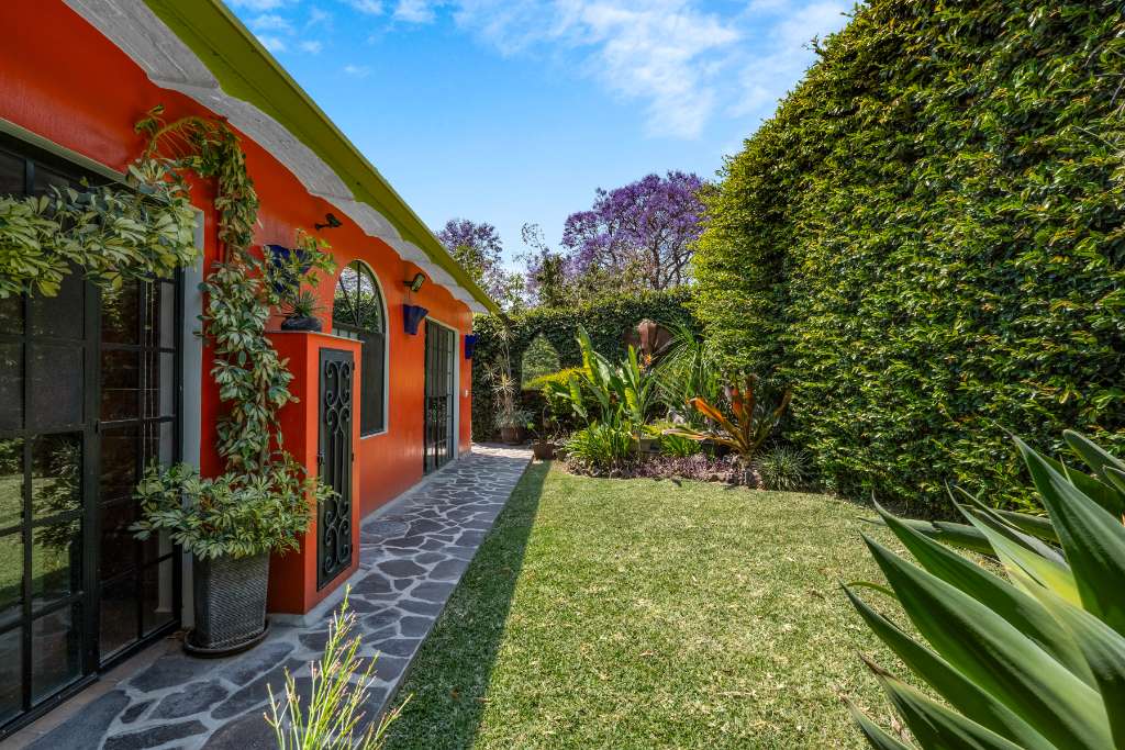Al entrar a la propiedad, le da la bienvenida un encantador jardín delantero en terrazas y una entrada para autos con una cochera que conduce a un garaje cerrado para un auto y un espacioso taller, perfecto para pasatiempos, proyectos o almacenamiento adicional. Una agradable área de estar frontal con una fuente, rodeada de árboles en flor y un colorido paisajismo, crea una primera impresión cálida y acogedora. En la parte delantera de la propiedad hay una amplia recámara privada con baño completo en suite, que ofrece un espacio cómodo e independiente para visitas o para dedicarse a sus pasatiempos sin interrupciones.