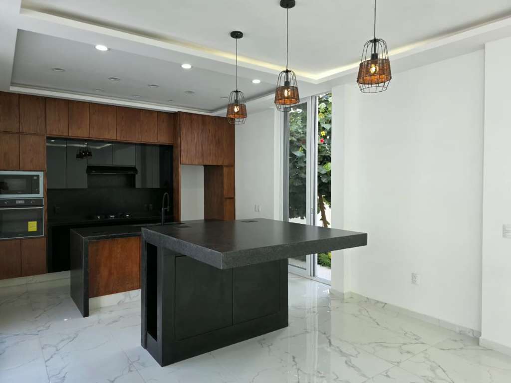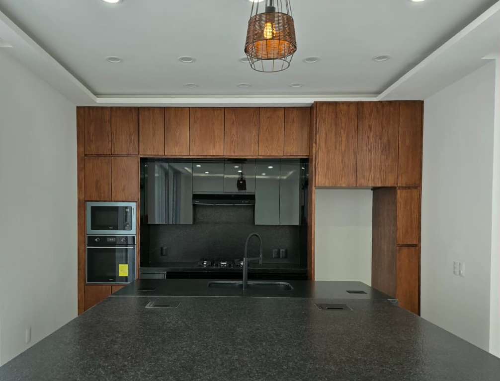 The interior design pays tribute to these views with a commanding triple-height living area that floods the space with natural light, drawing the eye toward the two architectural bridges connecting the upper floor. The kitchen serves as the home’s social centerpiece, featuring a chef’s bar topped with leather-finish granite for an elegant, organic feel. Designed for modern living, this bar includes integrated charging ports and high-end appliances, all framed by three-meter high ceilings that enhance the feeling of boundless space.