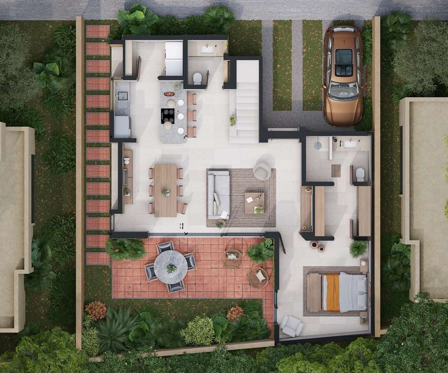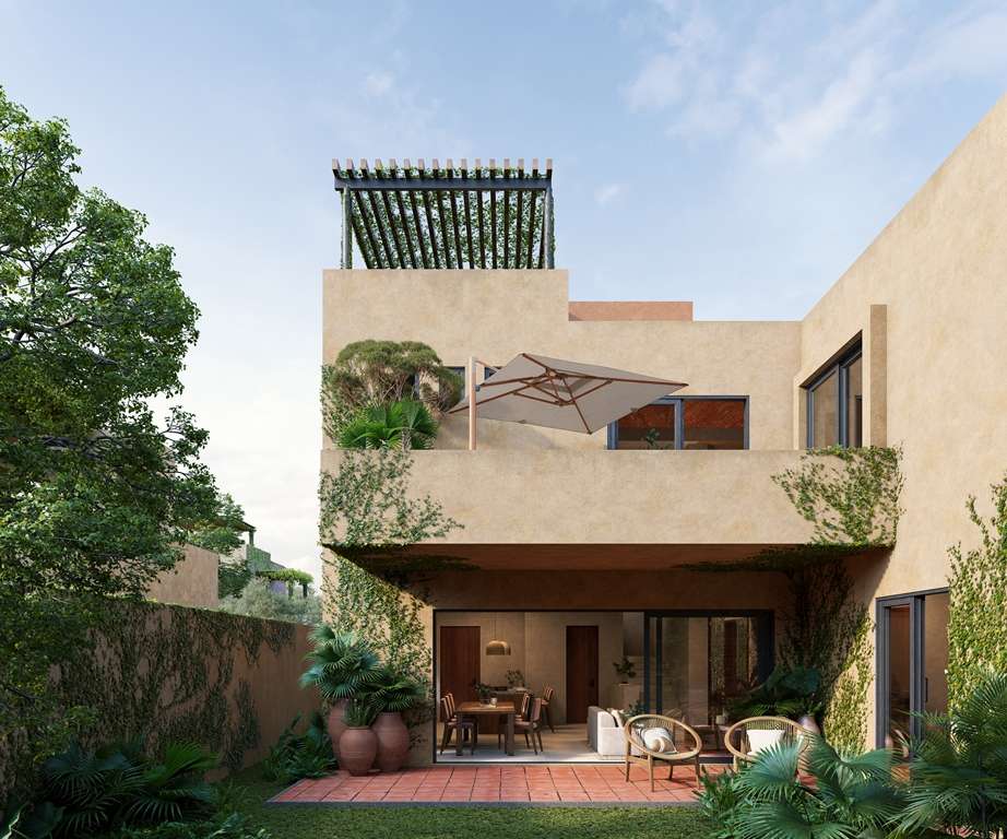 This Girasol model features 3 bedrooms (1 master suite on the ground floor and 1 master suite on the upper floor + 1 guest bedroom) that stand out for their spaciousness, natural ventilation, and superior finishes. It has a flexible area on the upper floor that can be used as a study or TV room, perfect for those who work from home, and also has a rooftop.