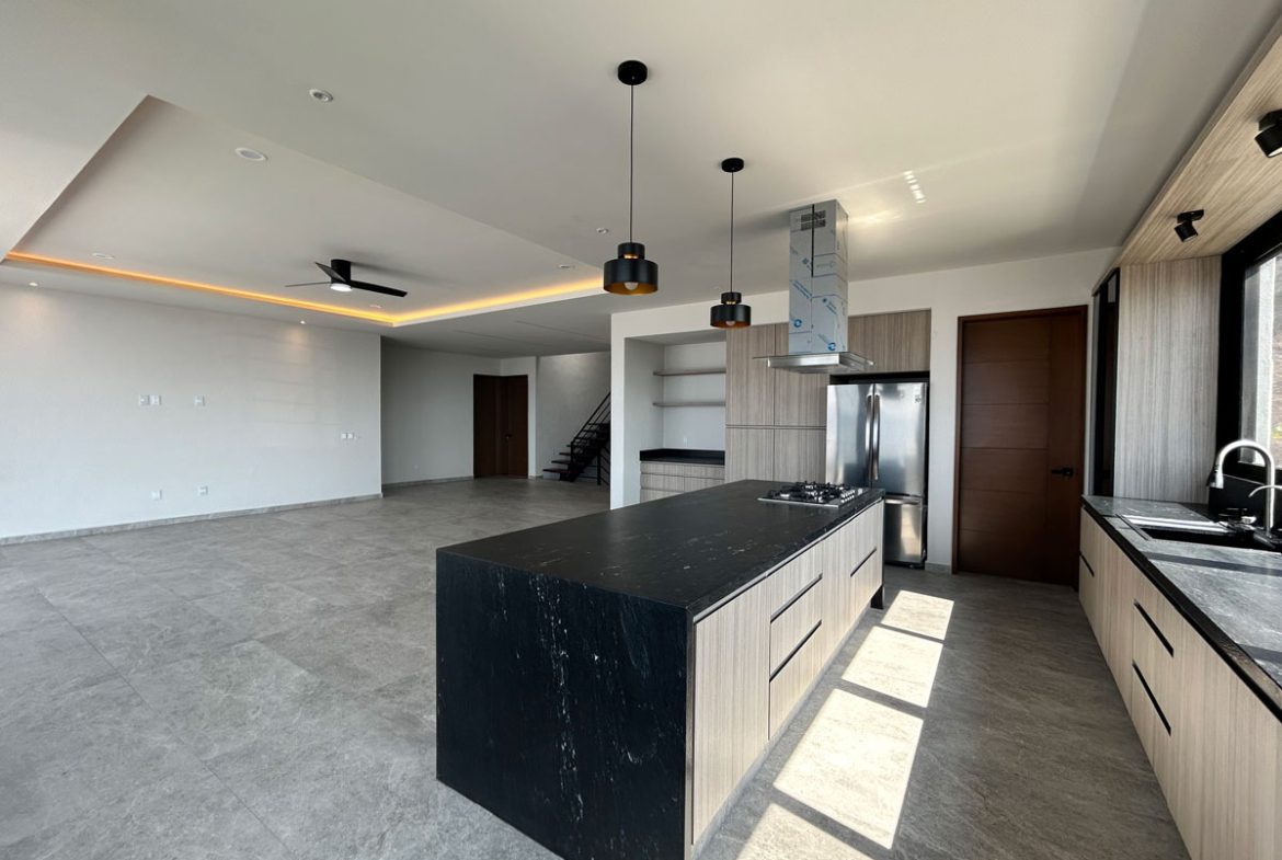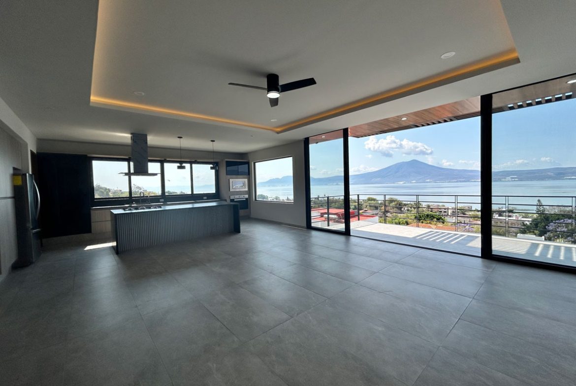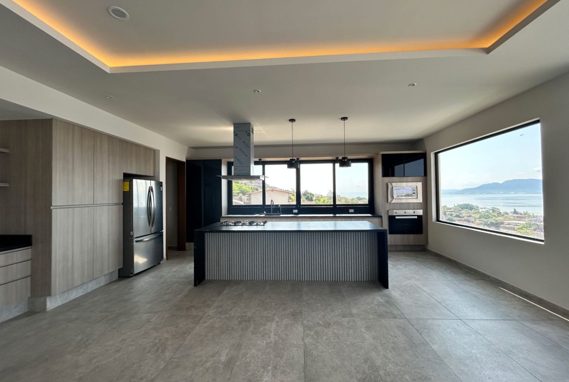 Al ingresar, te recibe un amplio espacio de concepto abierto que integra la cocina con espectaculares vistas al lago, creando un ambiente moderno y luminoso.