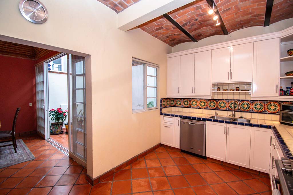 Adjacent to the dining room is a cozy, light-filled patio enclosed by high walls. It’s ideal for enjoying morning coffee, potted plants, or a cozy reading nook. Talavera tiles and decorative ceramics enhance the space’s Mexican character.