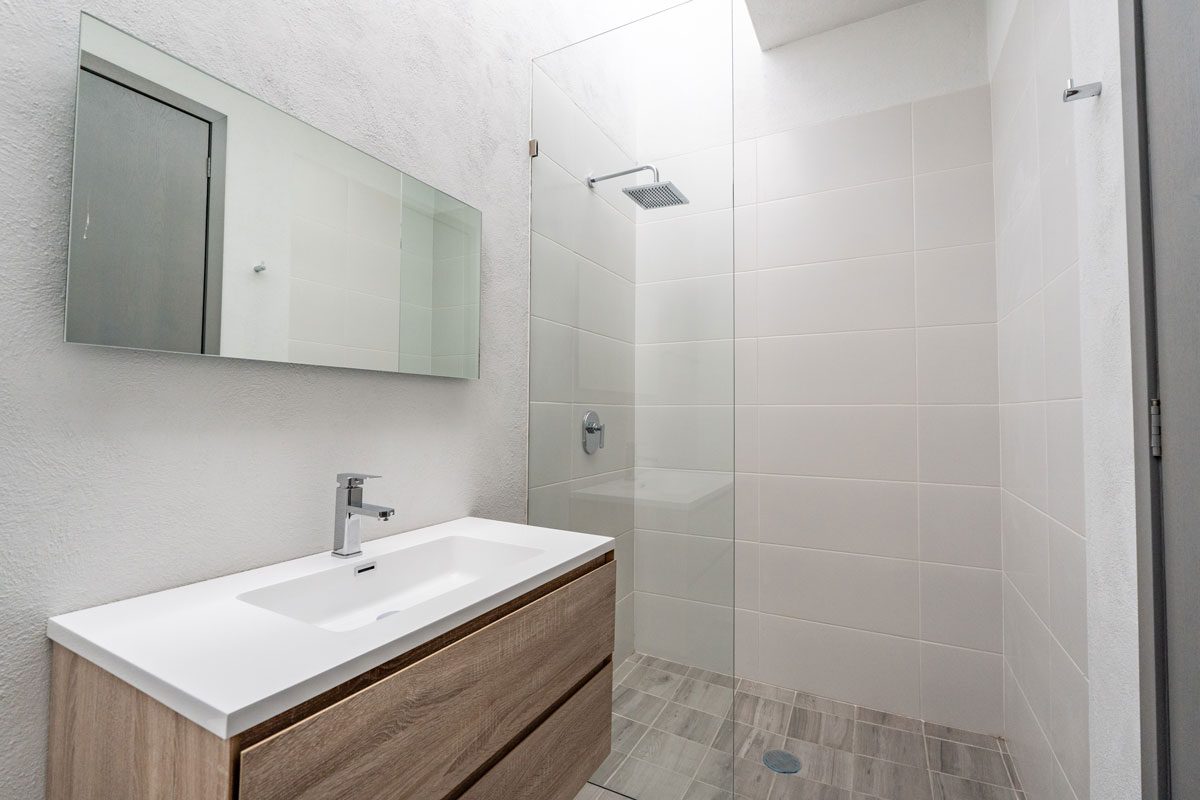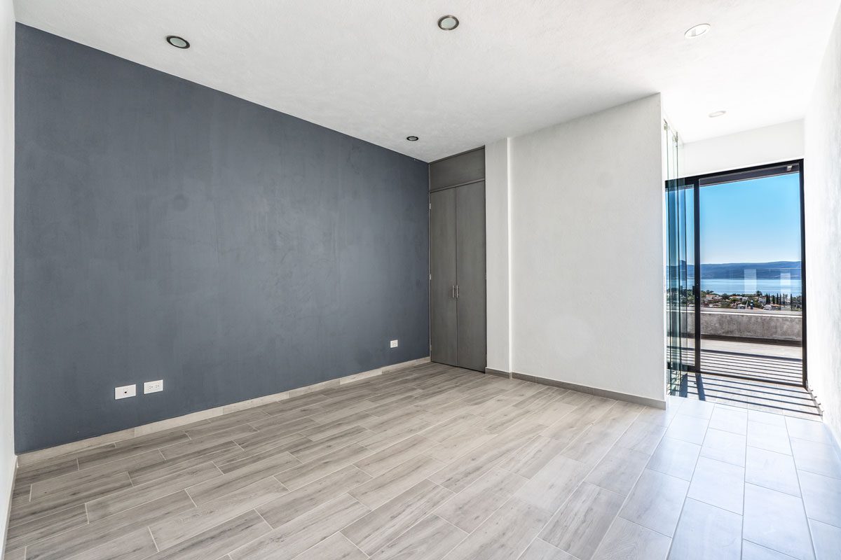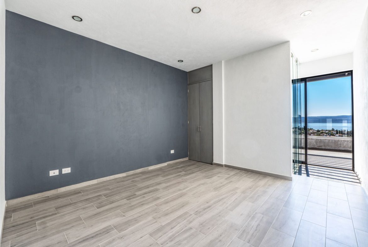 The third level offers three bedrooms, each with a full bathroom and ample closet space. One bedroom features beautiful direct lake views, while the other two present an open-concept design overlooking the interior terrace, enhancing natural light and a sense of openness.